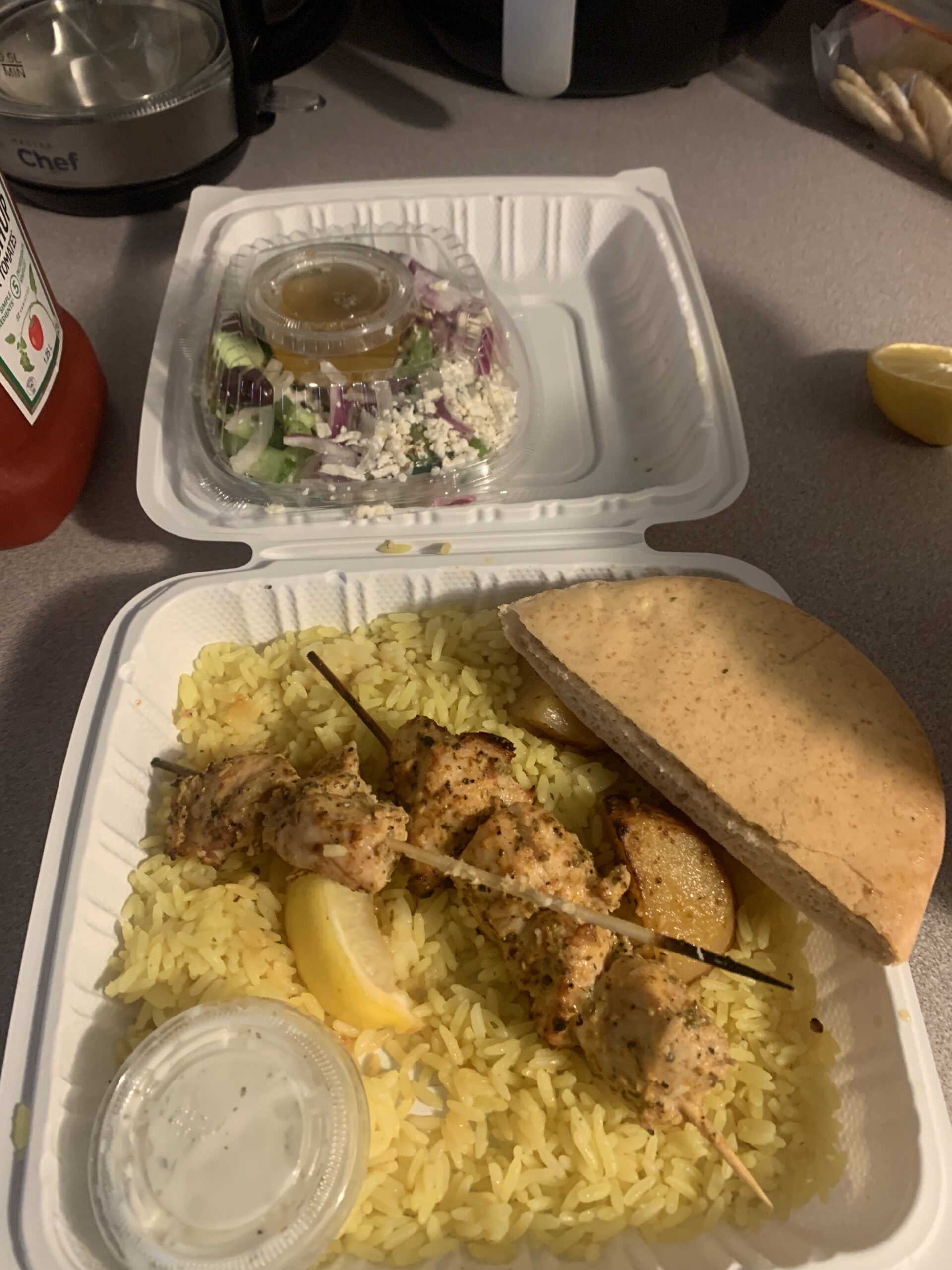 Your choice of chicken or lamb souvlaki wrapped in pita, paired with Greek salad.